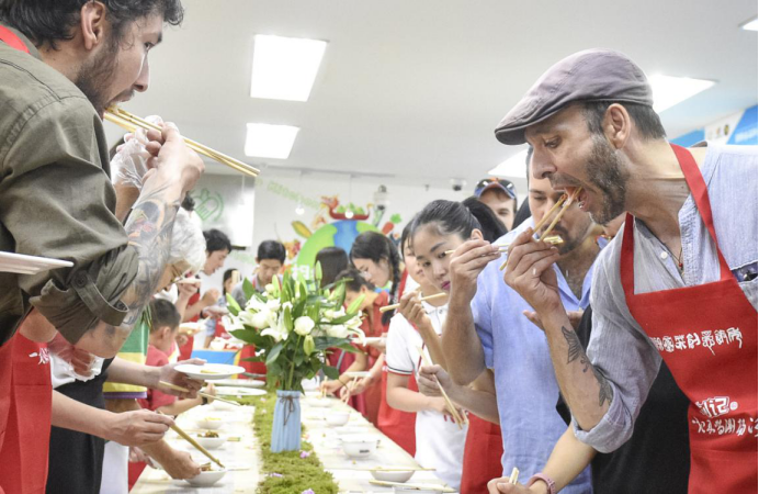 【《瀏陽河》詞作者親臨點贊】通過現場嘉賓共同參與,被命名為“一帶一路”、“為愛表白”、“天下大同”、“蒸情瀏陽”四個系列的20道文創蒸菜陸續端上飯桌,融匯世界各地的味覺體驗,共享“色、香、味、形、意”俱全的蒸菜盛宴,“瀏陽,好吃!”各國朋友紛紛表示特別喜愛這樣的美食體驗。