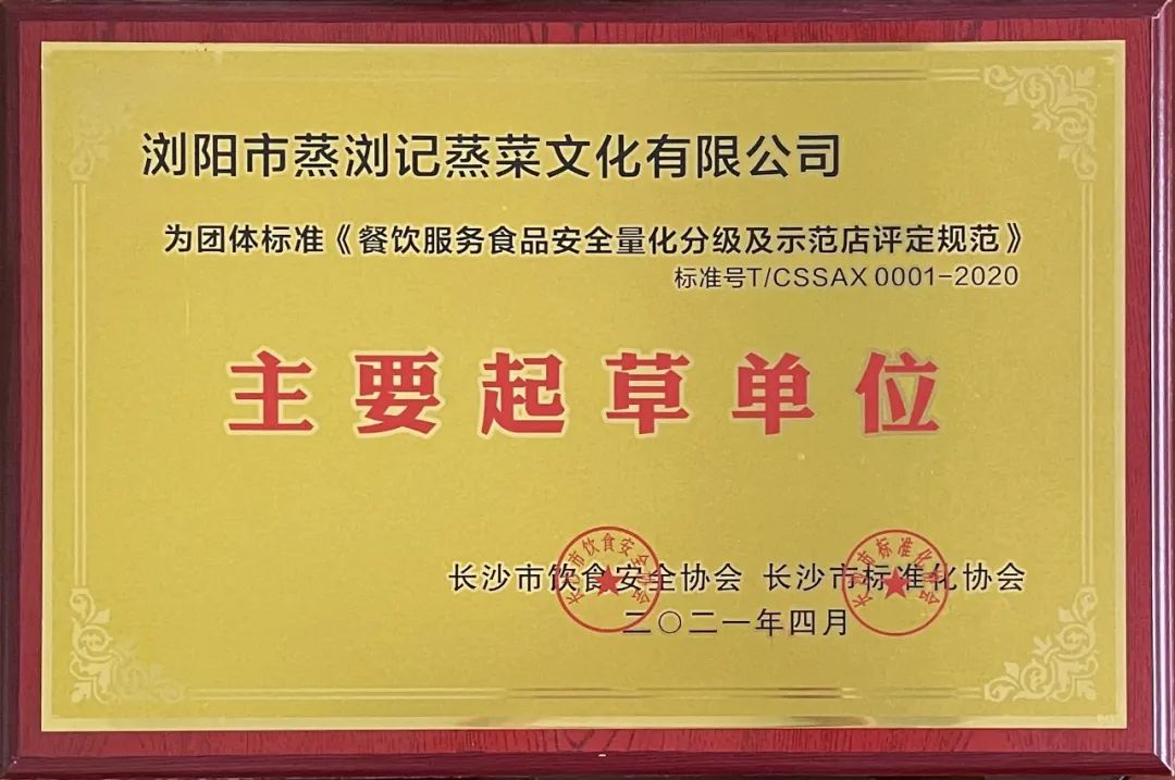 2020年底,湖南發(fā)布《餐飲服務(wù)食品安全量化分級(jí)及示范店評(píng)定規(guī)范》團(tuán)體標(biāo)準(zhǔn)。蒸瀏記是這一團(tuán)體標(biāo)準(zhǔn)的主要起草單位,得到了長(zhǎng)沙市飲食安全協(xié)會(huì)的表彰。